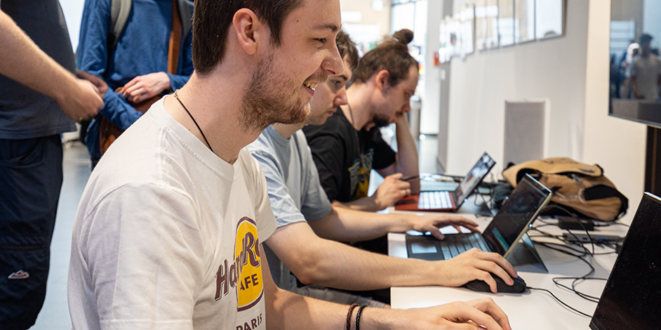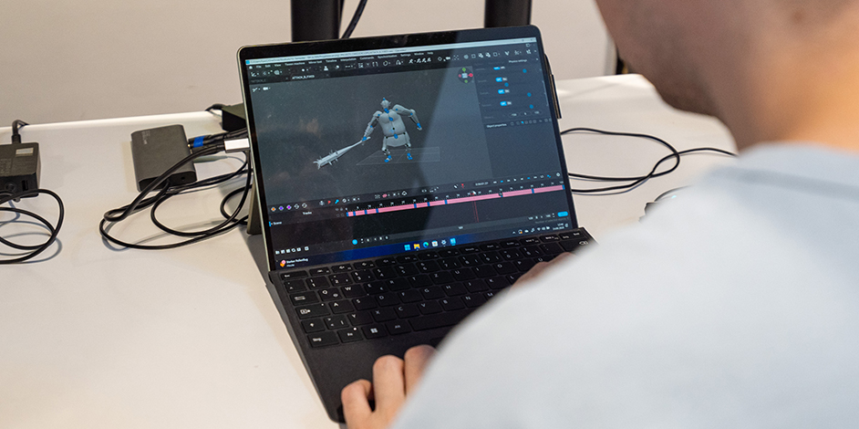 Einen weiteren Einblick in die Arbeit der Studierenden bot das sogenannte Live-Game-Development, bei dem mehrere studentische Projekt-Teams sich bei ihrer Arbeit an ihren Game-Projekten über die Schulter schauen ließen. So konnte man live dem 3D-Character-Design, der Assets-Erstellung und anderen Arbeitsschritten der Videospielentwicklung zusehen. Und damit man auch ohne Vorwissen verstand was dort vor sich ging, wurde diese Arbeit auf einem großen Monitor projeziert und jeweils von einem Team-Mitglied moderiert.