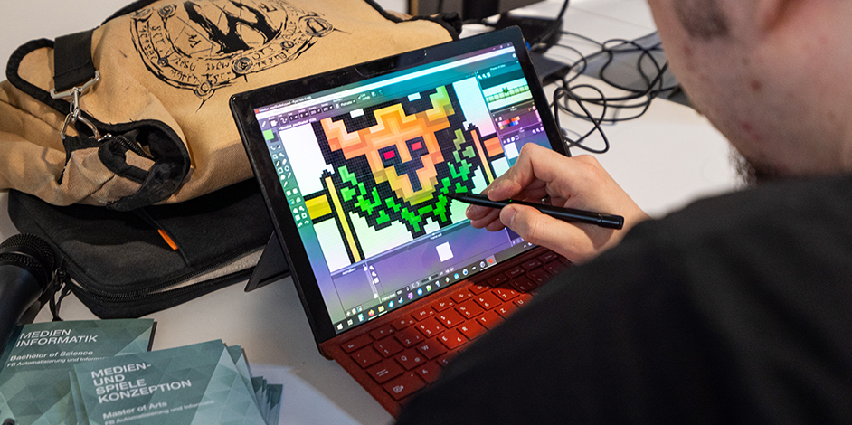 Schlagworte: "Mein Studium", 3D, Ausstellung, Bachelor, Design, Film, Fotografie, Game Design, Game Development, Games, Gestaltung, Grafik-Design, Grafikdesign, Hochschule, Interaktivität, Master, medien, Medien- und Spielekonzeption (M.A.), Mediengestaltung, Medieninformatik (B.Sc.), MuSK, Postproduction, Spiele, Spieleentwicklung, Spieleprogrammierung, Studierende, Tag der offenen Tür, Technik