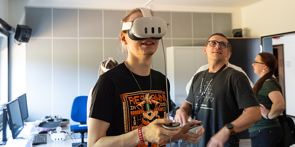 Auch 2025 gab es wieder den Tag der offenen Tür der Hochschule Harz, bei dem sich alle Studiengänge der Öffentlichkeit vorstellen. Das ist auch für unsere Studiengänge Medieninformatik B.Sc. und Medien- und Spielekonzeption M.A. immer ein schöner Anlass studentische Arbeiten zu zeigen und mit Interessierten ins Gespräch zu kommen.